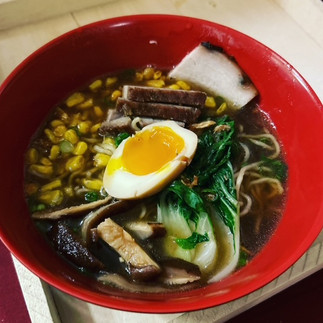 3. Pork belly ramen bowl- Roasted corn, shiitake mushrooms, baby bok choy, soft ramen egg, green onions and slow cooked pork belly.